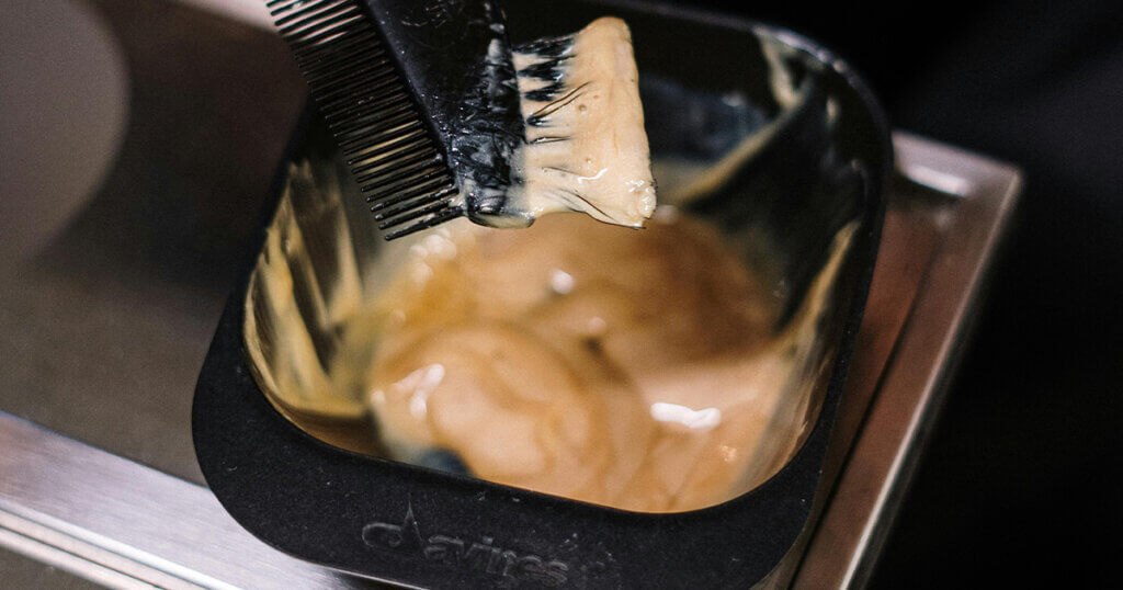 当店で使用している痛みにくいヘアカラー。髪の潤いをキープしながらカラーを入れるのですが、成分の配合がポイントとなります。